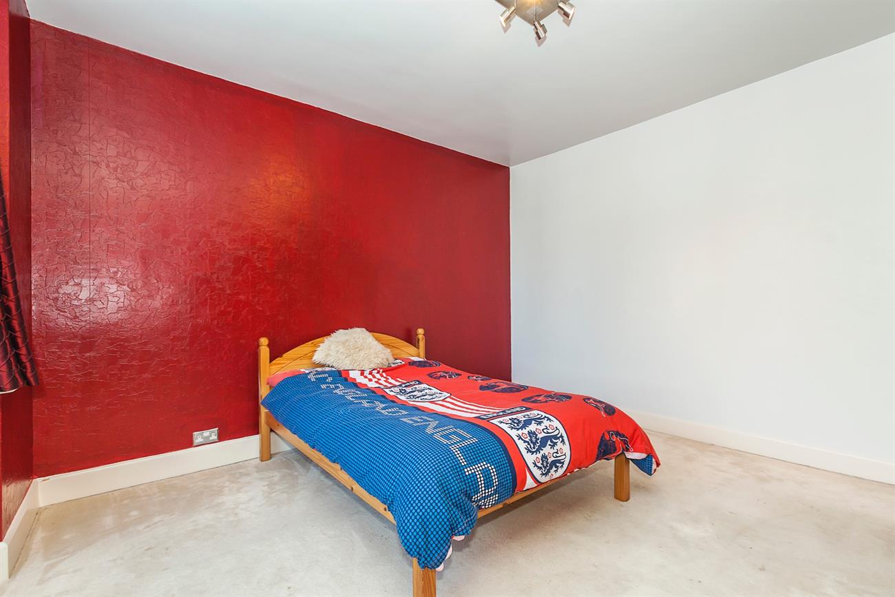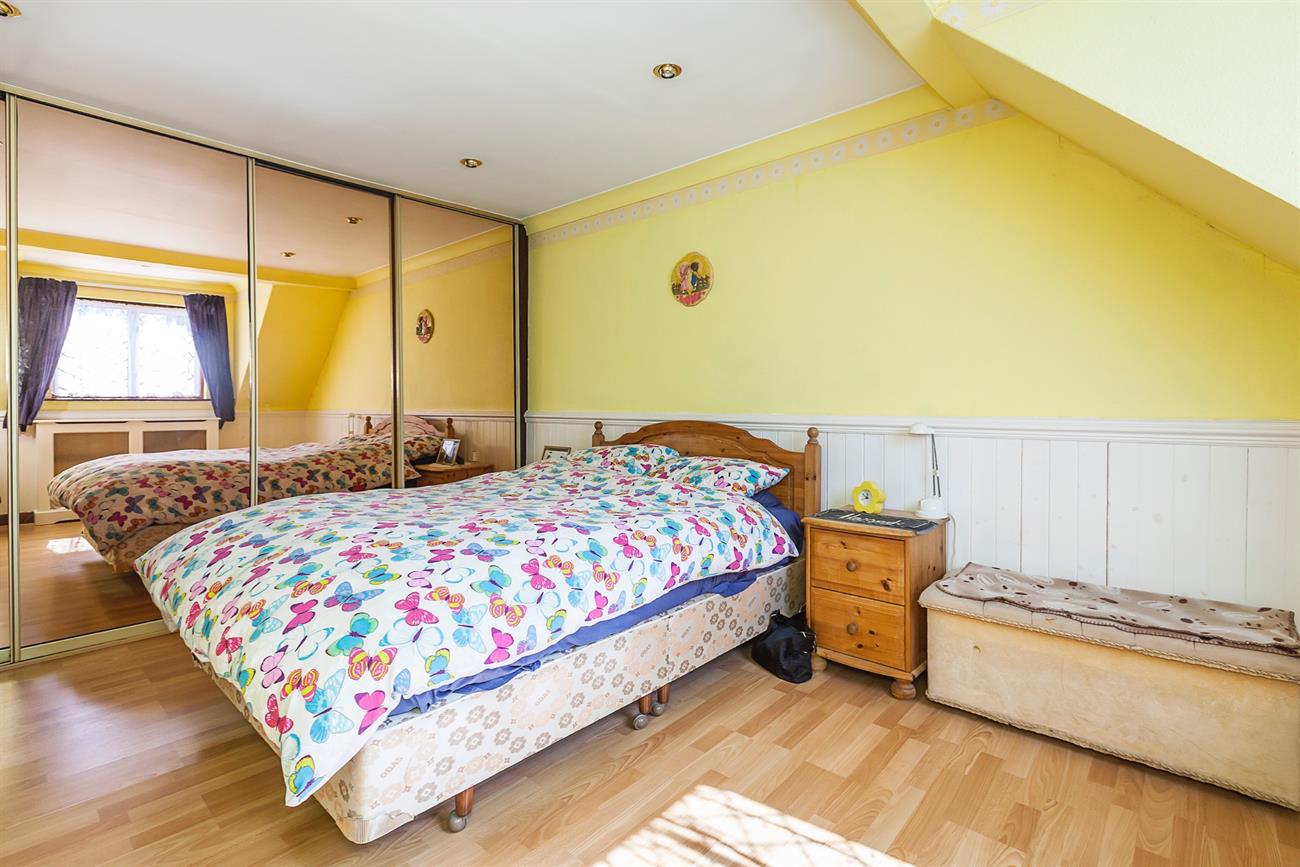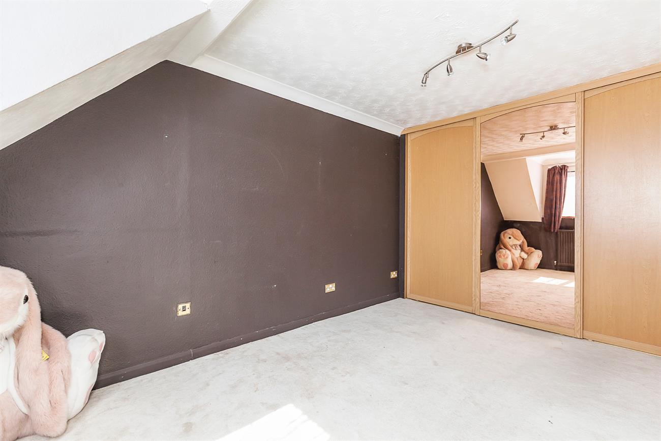 Bedroom Three: 14′ 1" x 11′ 1" Fully range fitted wardrobes with mirrored sliding doors, laminate floor covering, double glazed window to rear. Radiator and power points.