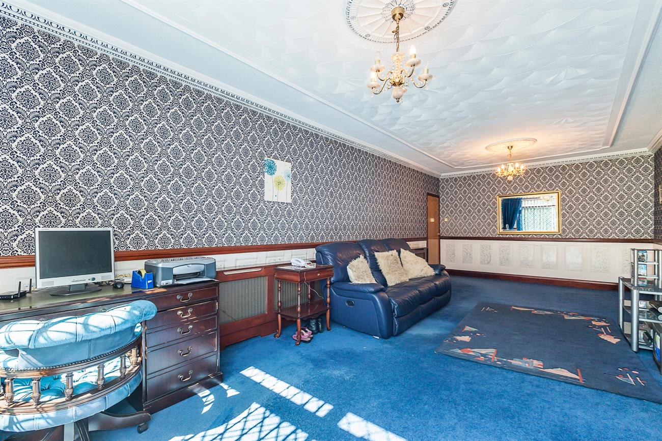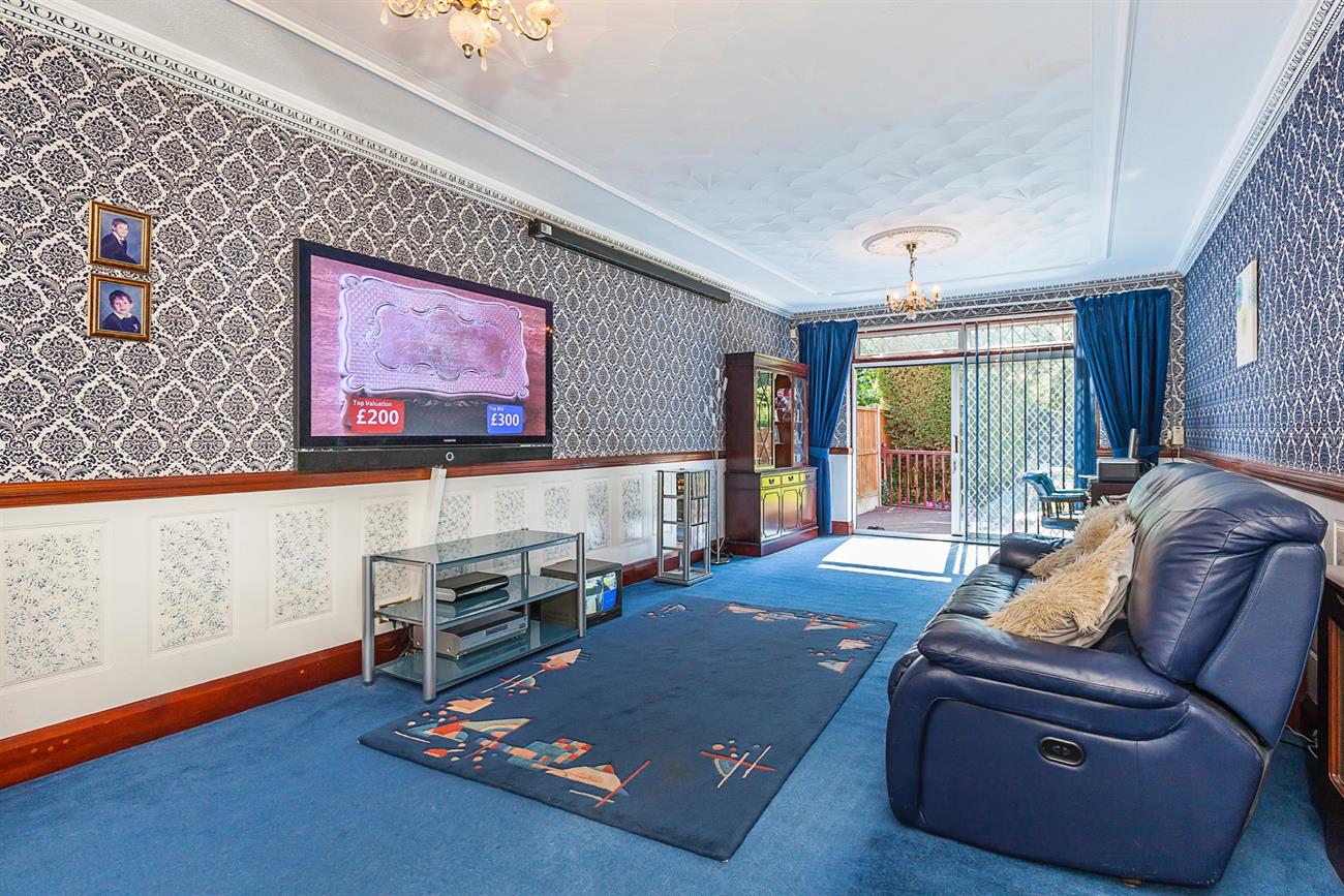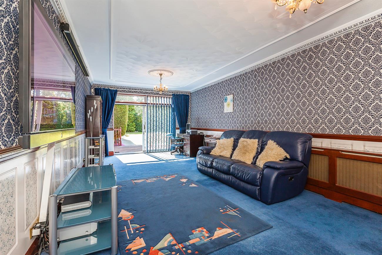 Lounge: 26′ 10" X 10′ 5" : With Open aspects to rear garden this excellent size family lounge has featured moldings to ceilings, and center roses, sliding double glazed doors lead onto a decked area and in turn onto the laid to lawn garden.