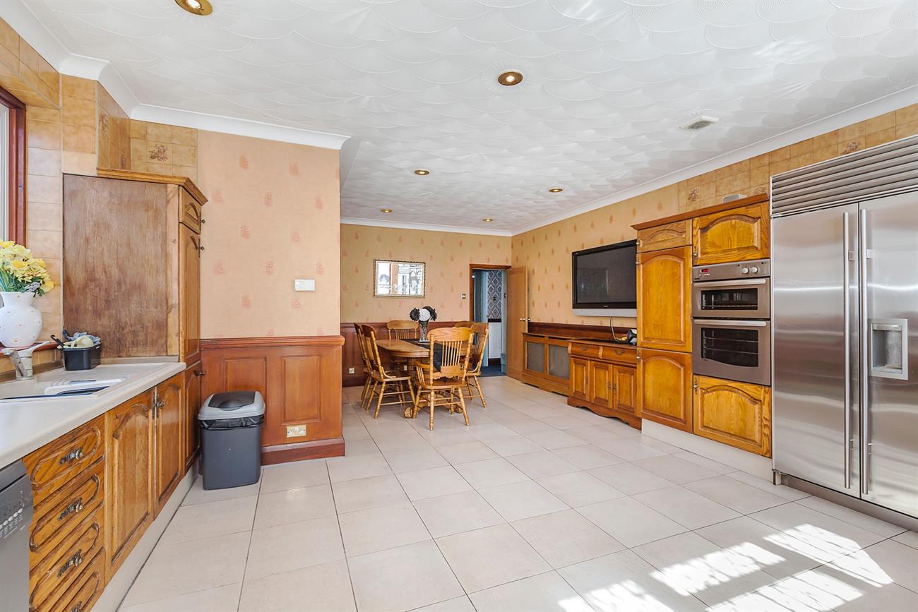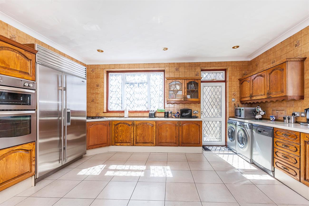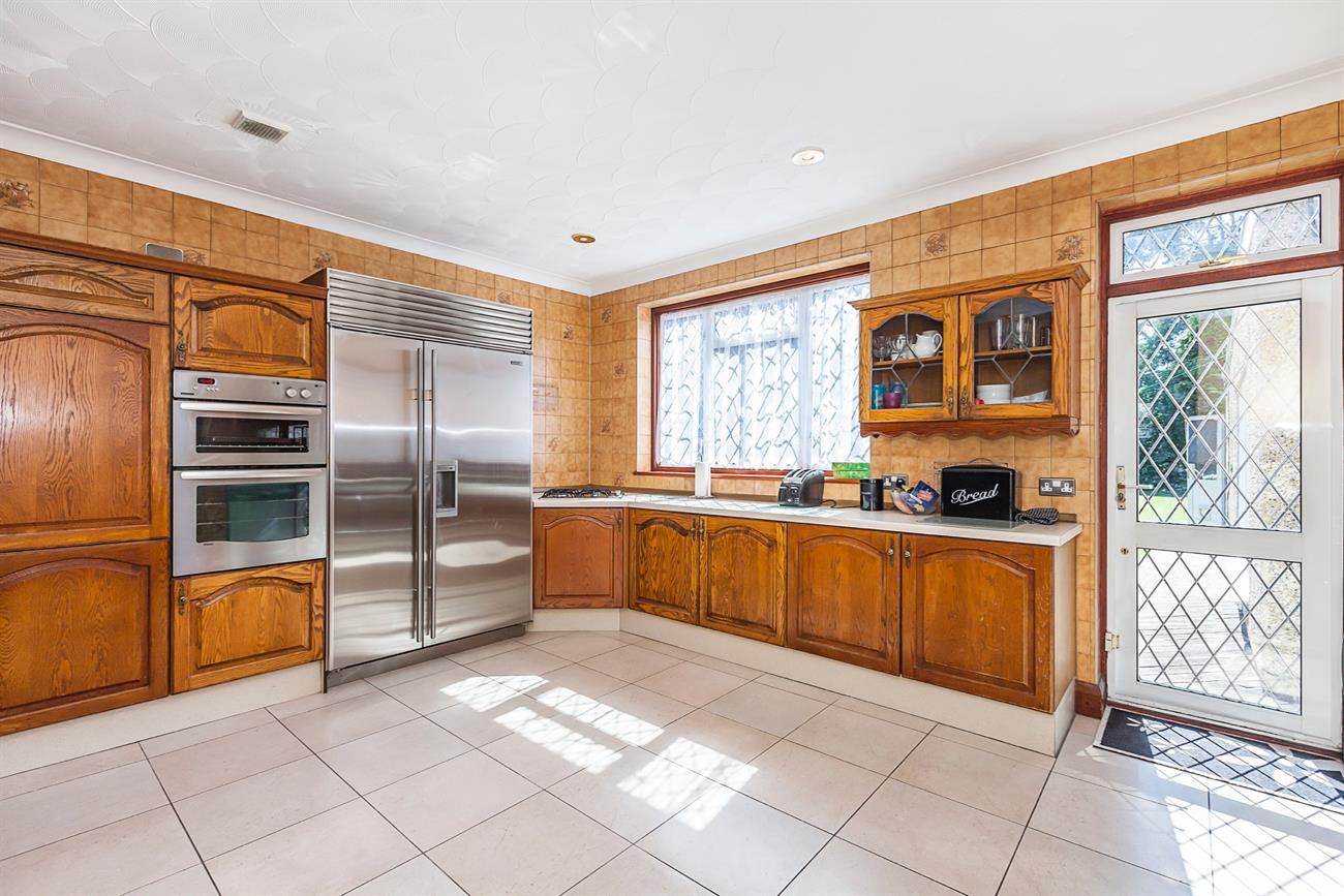 Kitchen /Diner : 22’7" x 16′ This family sized kitchen is fitted with a vast range of wall and base units. Roll top work surfaces with tiled up stands, integrated sink unit with mixer tap. Integrated double oven and separate electric hob. Double Sub Zero freezer. Double glazed windows to side and rear with door leading to decked area and rear lawn. Plumbing for dishwasher, washing machine and tumble dryer. Ground