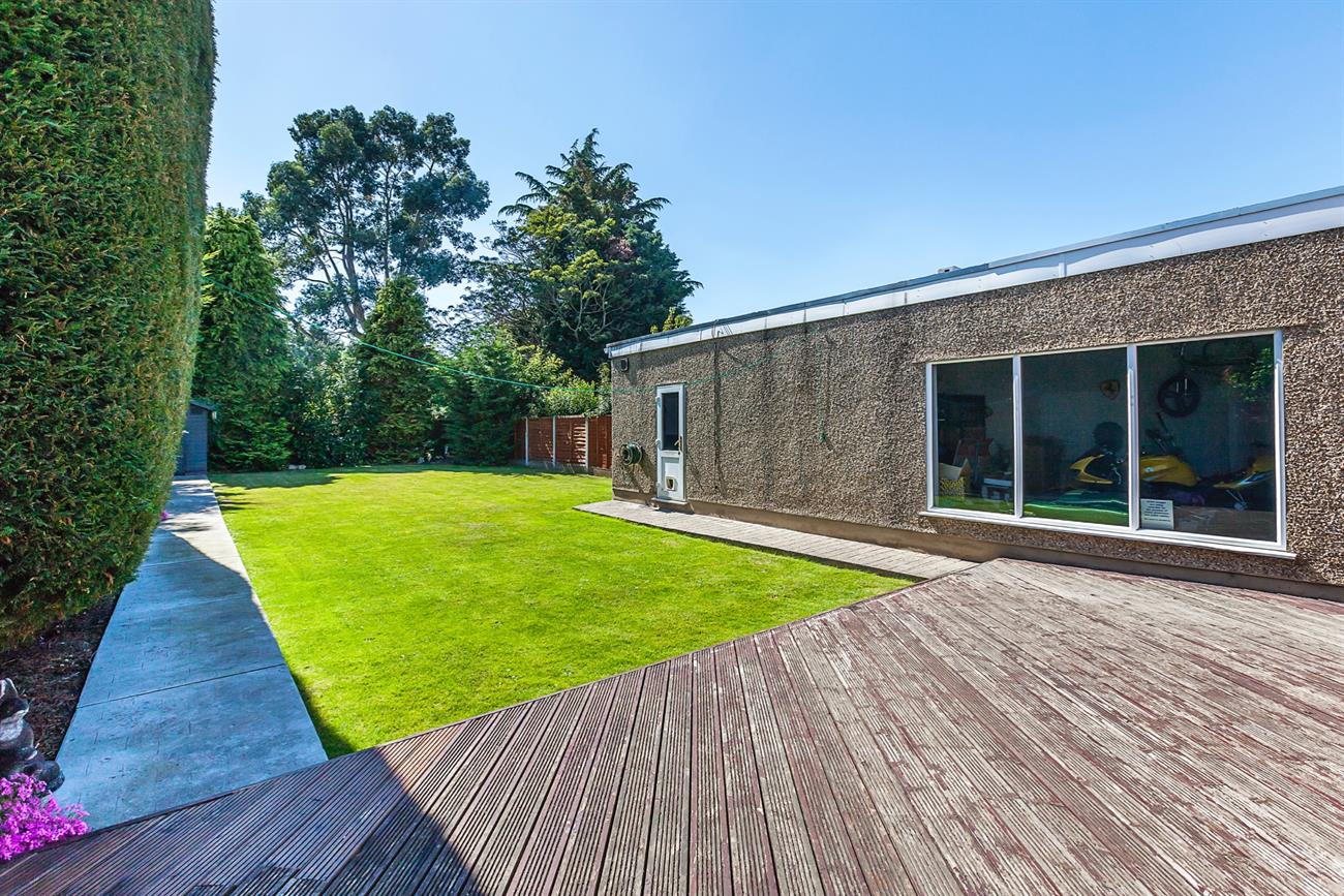 Decked rear patio area leading to rear Garden Approx 80ft laid to lawn with mature trees surrounding.