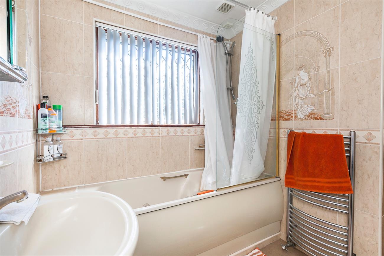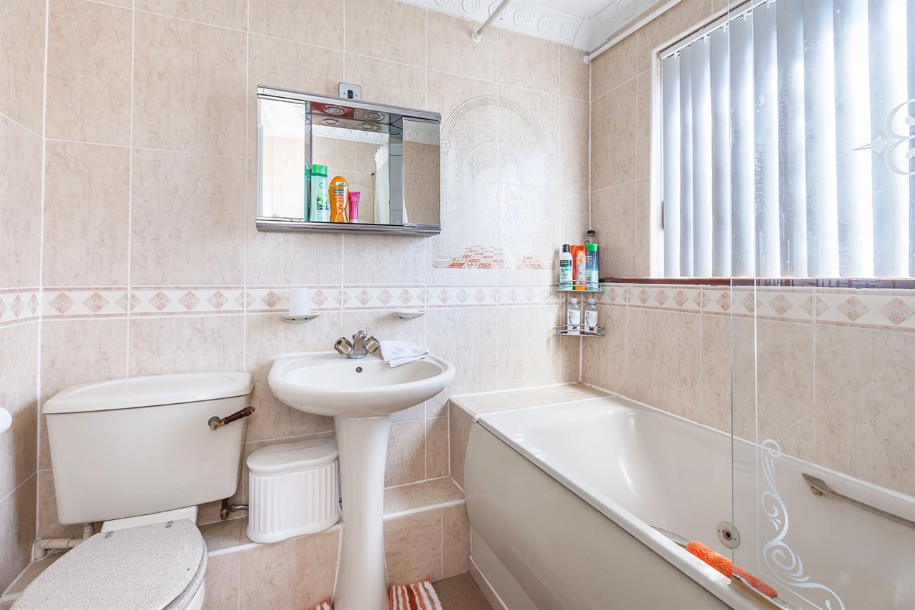 Bathroom: Three piece suite with separate shower over. Fully tiled pedestal wash hand basin, low level w.c vanity unit with mirrored lighting back. Towel rail. Double glazed window to rear.